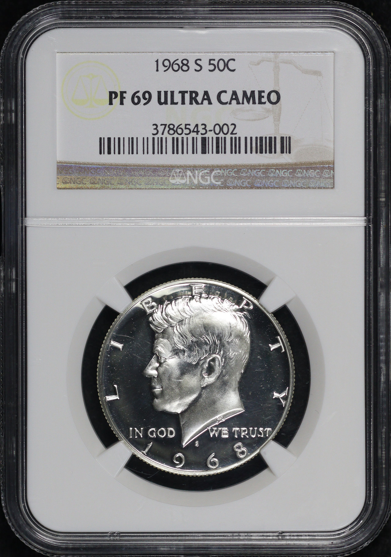 1968-S Kennedy Half Dollar NGC PF-69 Ultra Cameo. There is some very faint, spotty crimson toning on the reverse, and some minor scuffs on the NGC holder.