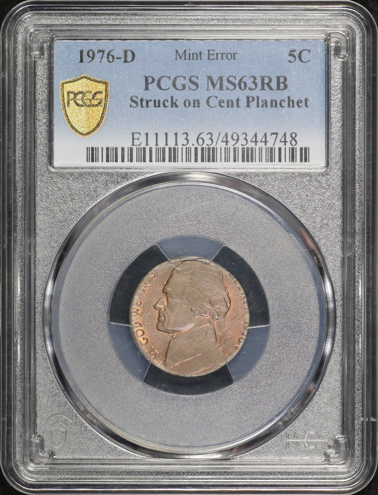 1976-D Jefferson Nickel PCGS MS-63 RB Mint Error Struck on Cent Planchet.