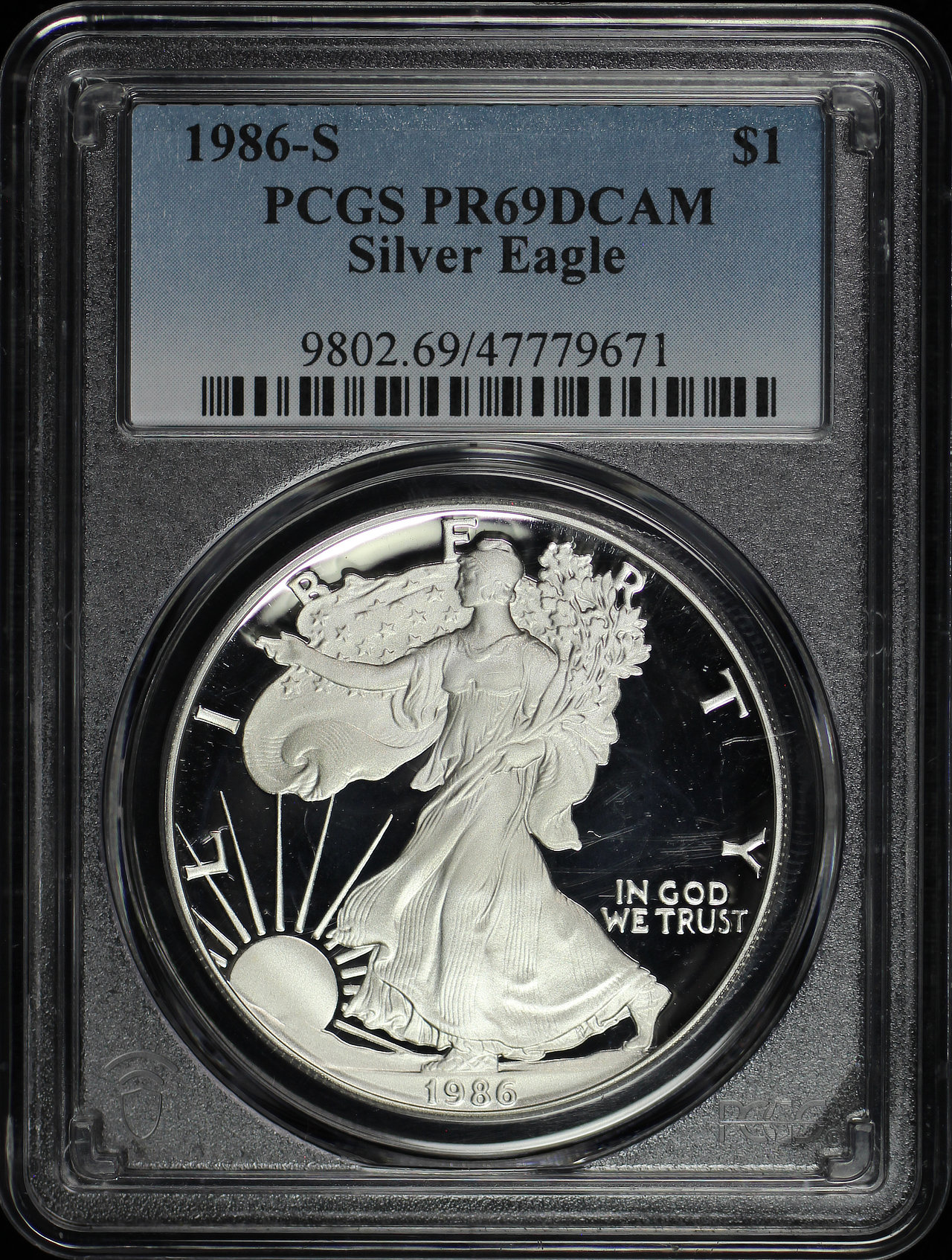 1986-S Silver Eagle PCGS PR-69 DCAM designed by Adolph A. Weinman and John Mercanti.