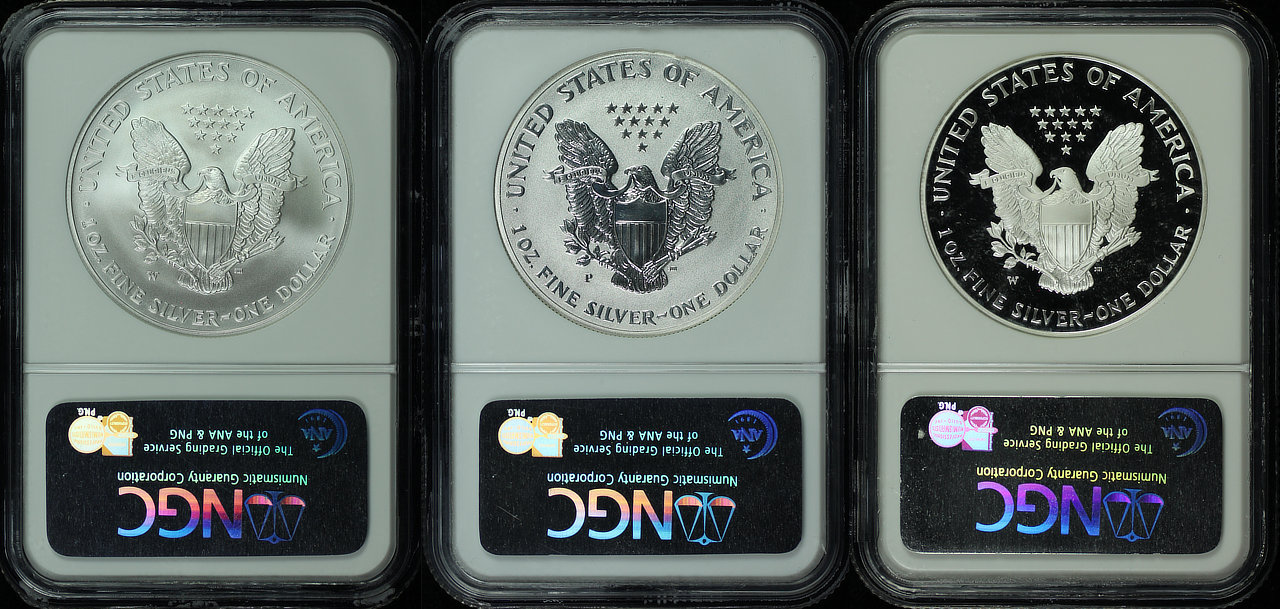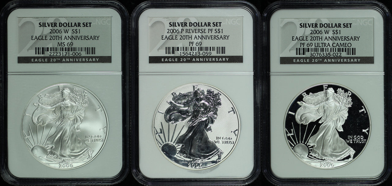2006-W American Silver Eagle West Point Eagle Set NGC MS-69, SP-69 Enhanced Finish & PF-69 Reverse Proof 20th Anniversary Silver Dollar Set.