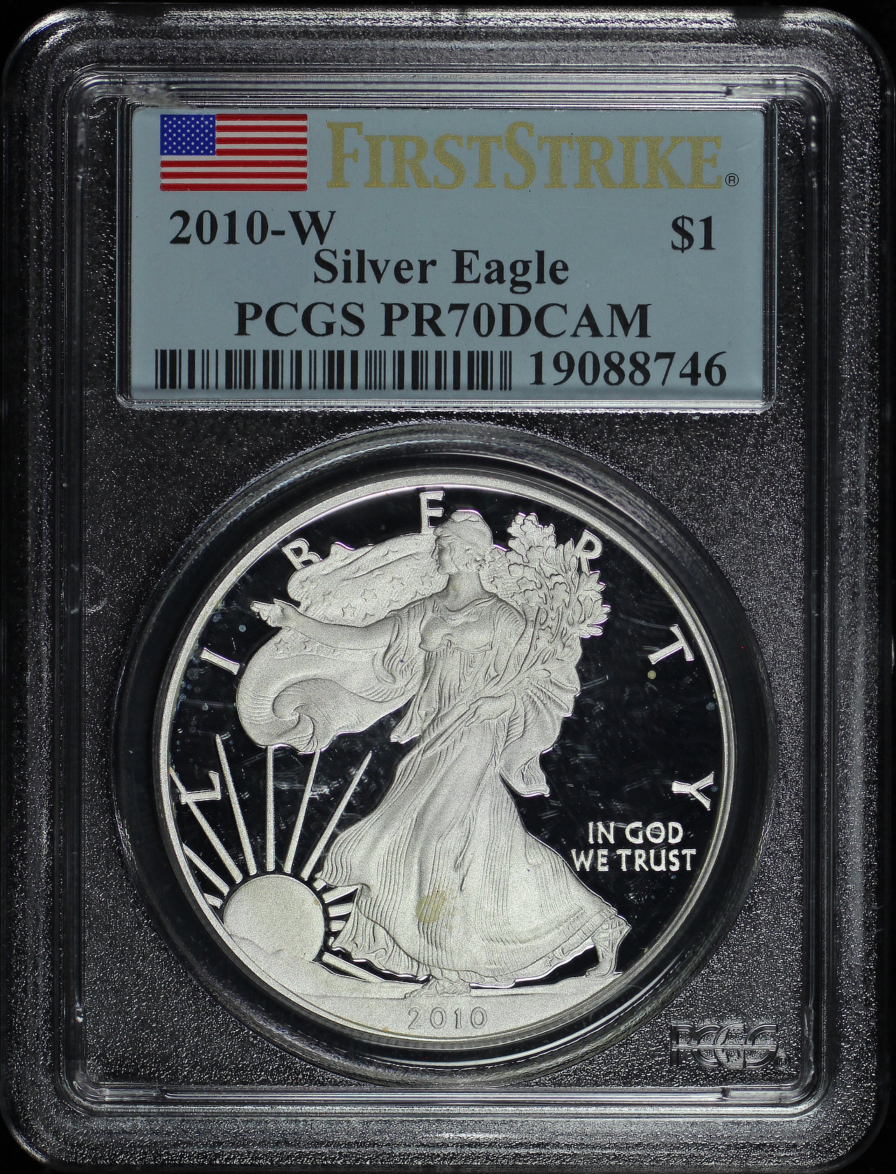 2010-W Silver Eagle PCGS PR-70 DCAM First Strike designed by Adolph A. Weinman and John Mercanti.