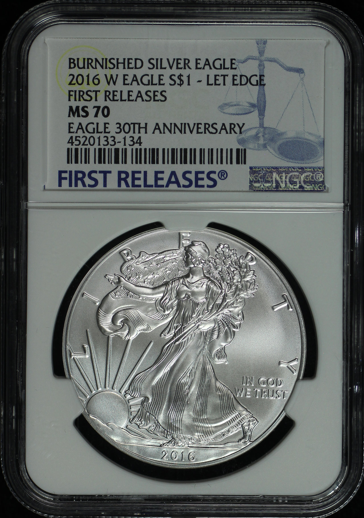 2016-W Burnished Silver Eagle NGC MS-70 Letter Edge First Release 30th Anniversary.