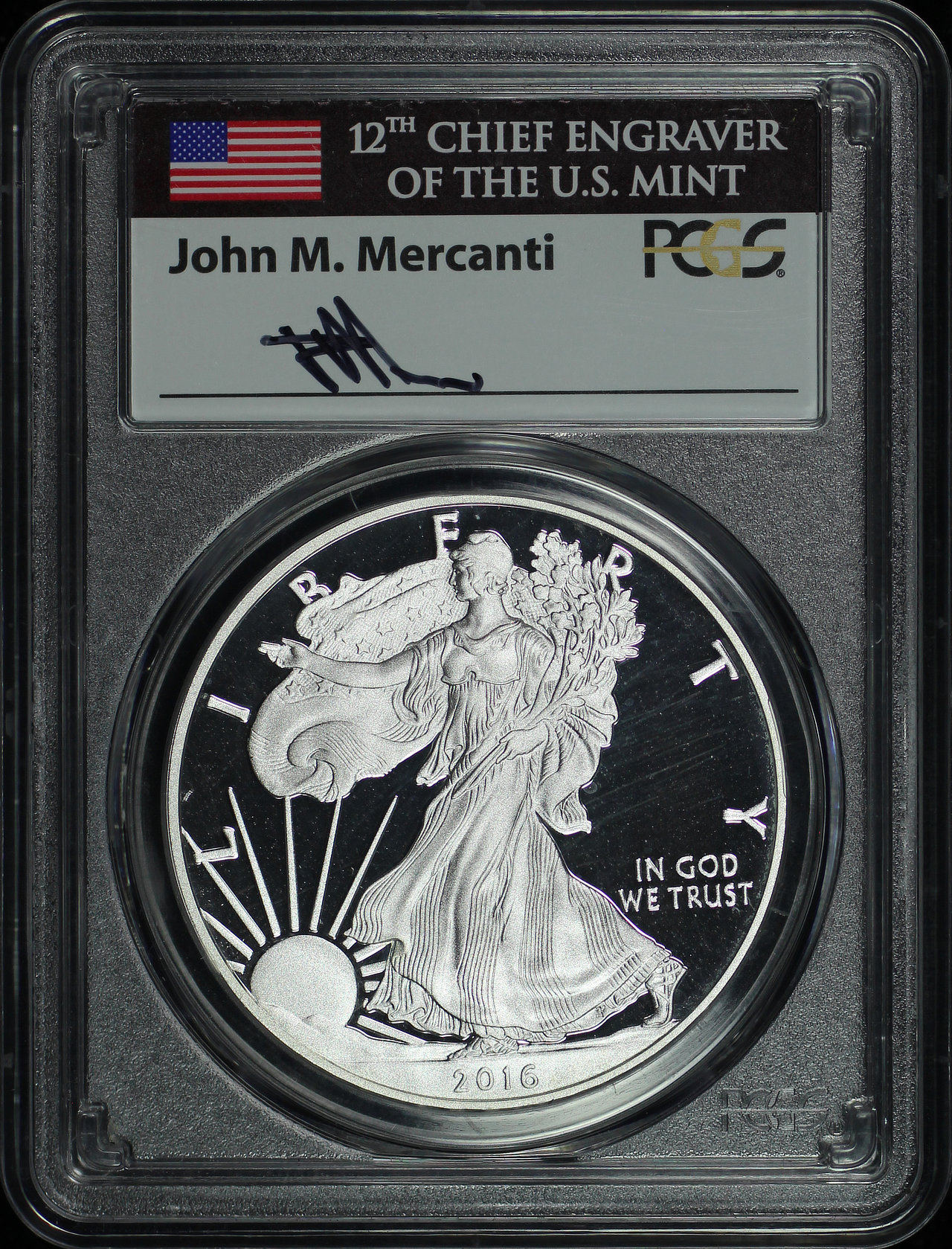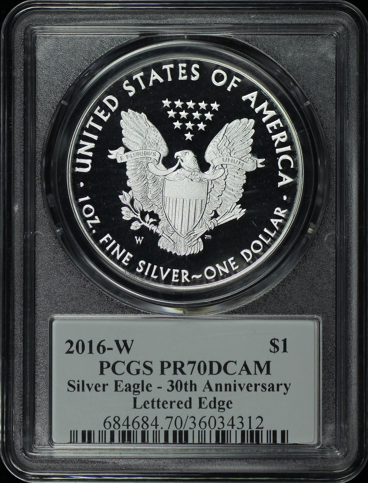 2016-W Silver Eagle 30th Anniversary Lettered Edge PCGS PR-70 DCAM Lettered Edge John M. Mercanti Label.