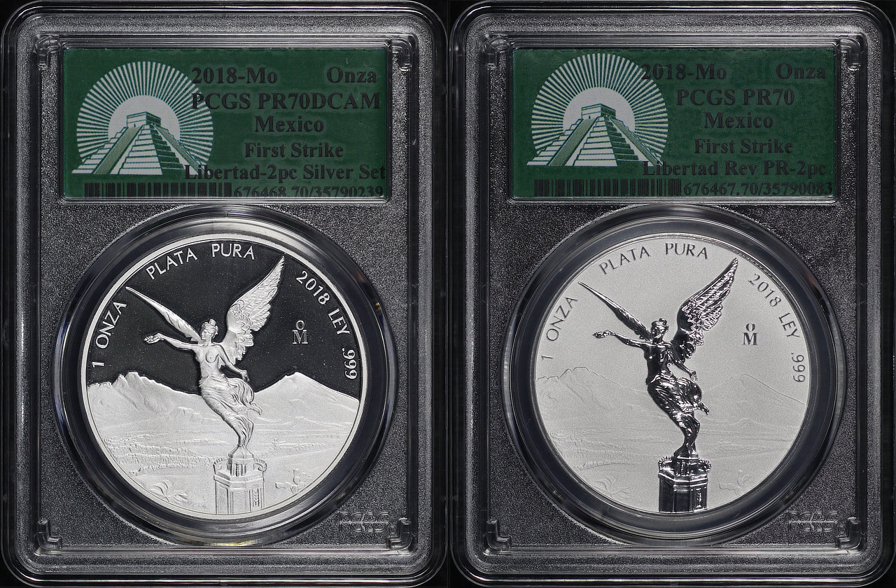 2018-Mo Mexico Silver Libertad 1 Onza 2pc Set PCGS PR-70 DCAM & Reverse PF-70 First Strike Green Pyramid Label
