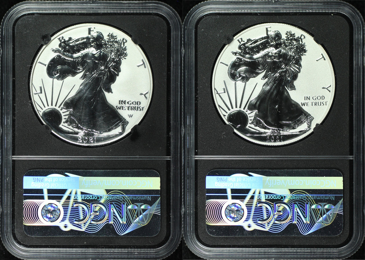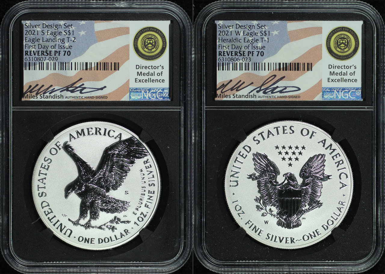 2021 Silver Eagle Type 1 & 2 NGC PF-70 Reverse Proof Miles Standish Silver Design Set Signature Label First Day of Issues.
