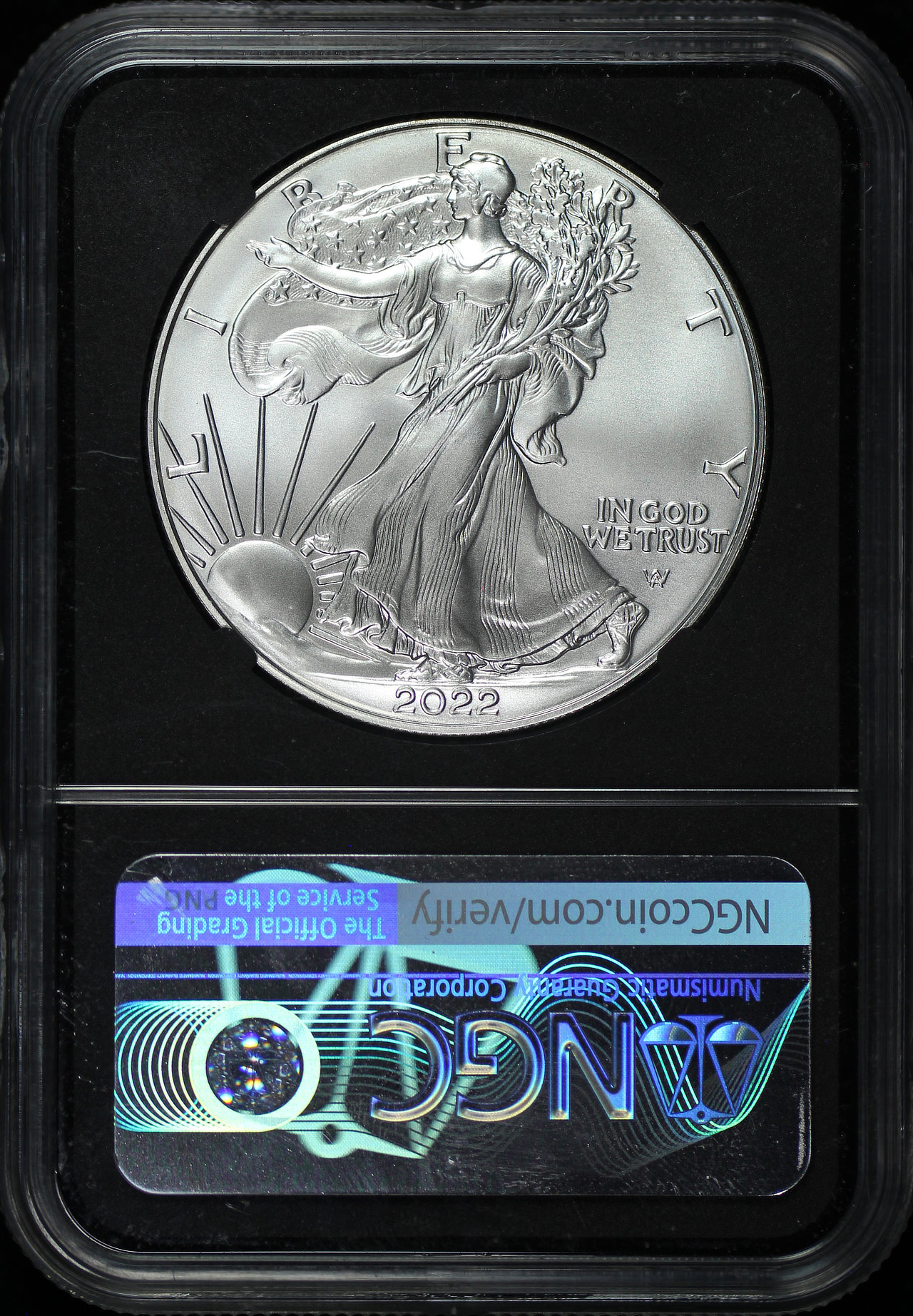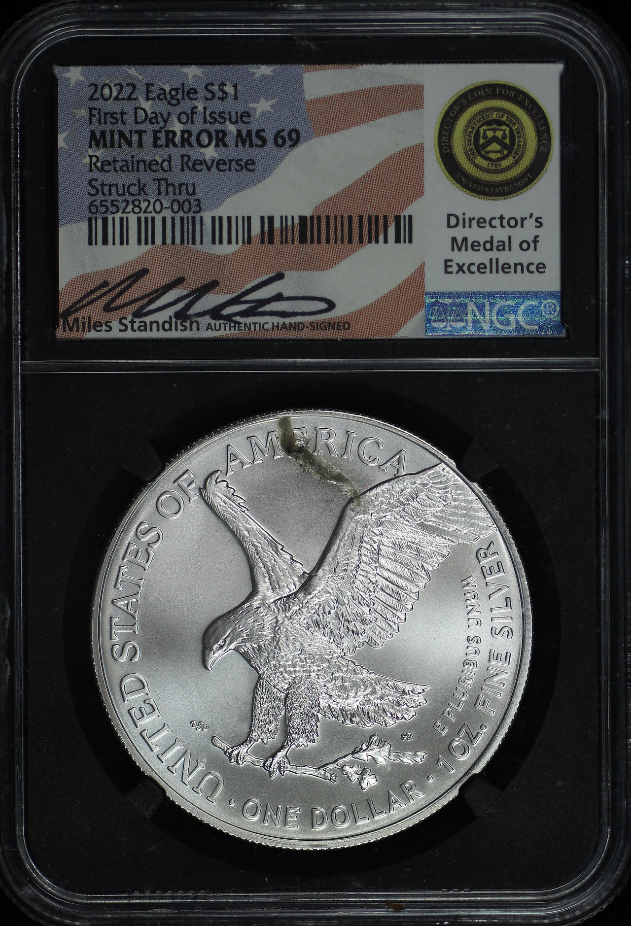 2022 Silver Eagle NGC MS-69 Retained Reverse Struck Thru First Day of Issue.