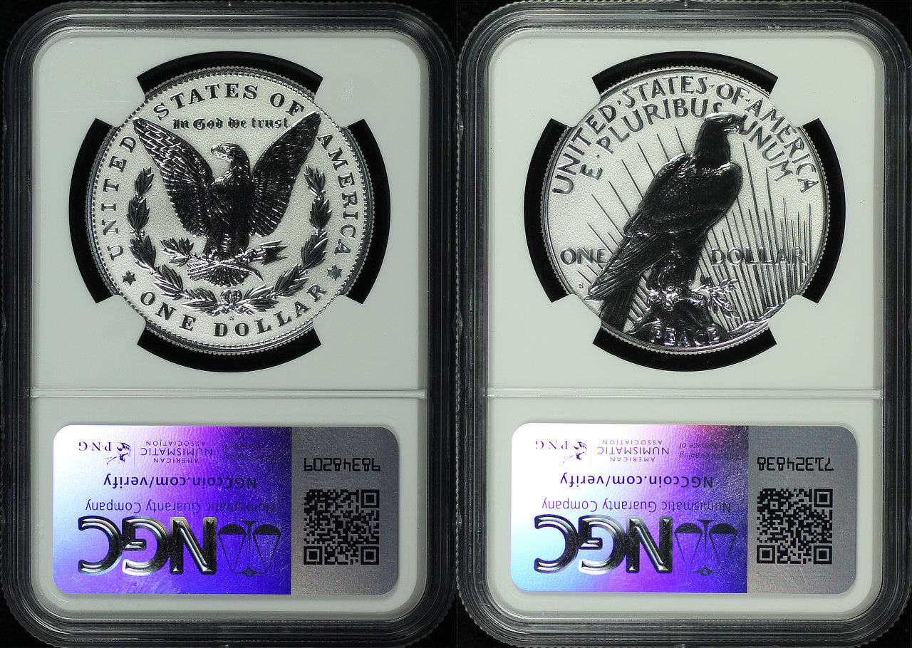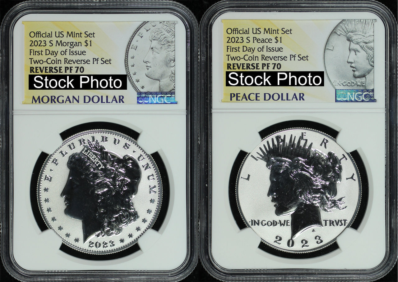 2023-S Two Coin Peace & Morgan Dollar Set NGC PF-70 Reverse Proof, First Day of Issue.