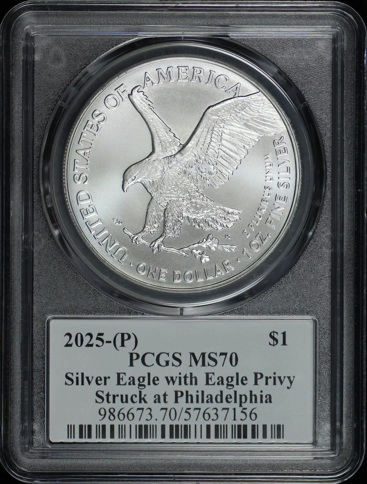 2025-P Silver Privy Eagle with PCGS MS-70 Struck At Philadelphia.