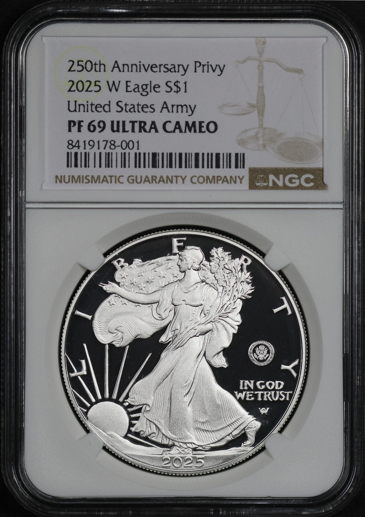 2025-W Silver Eagle NGC PF-69 UC 250th Anniversary Privy United States Army.