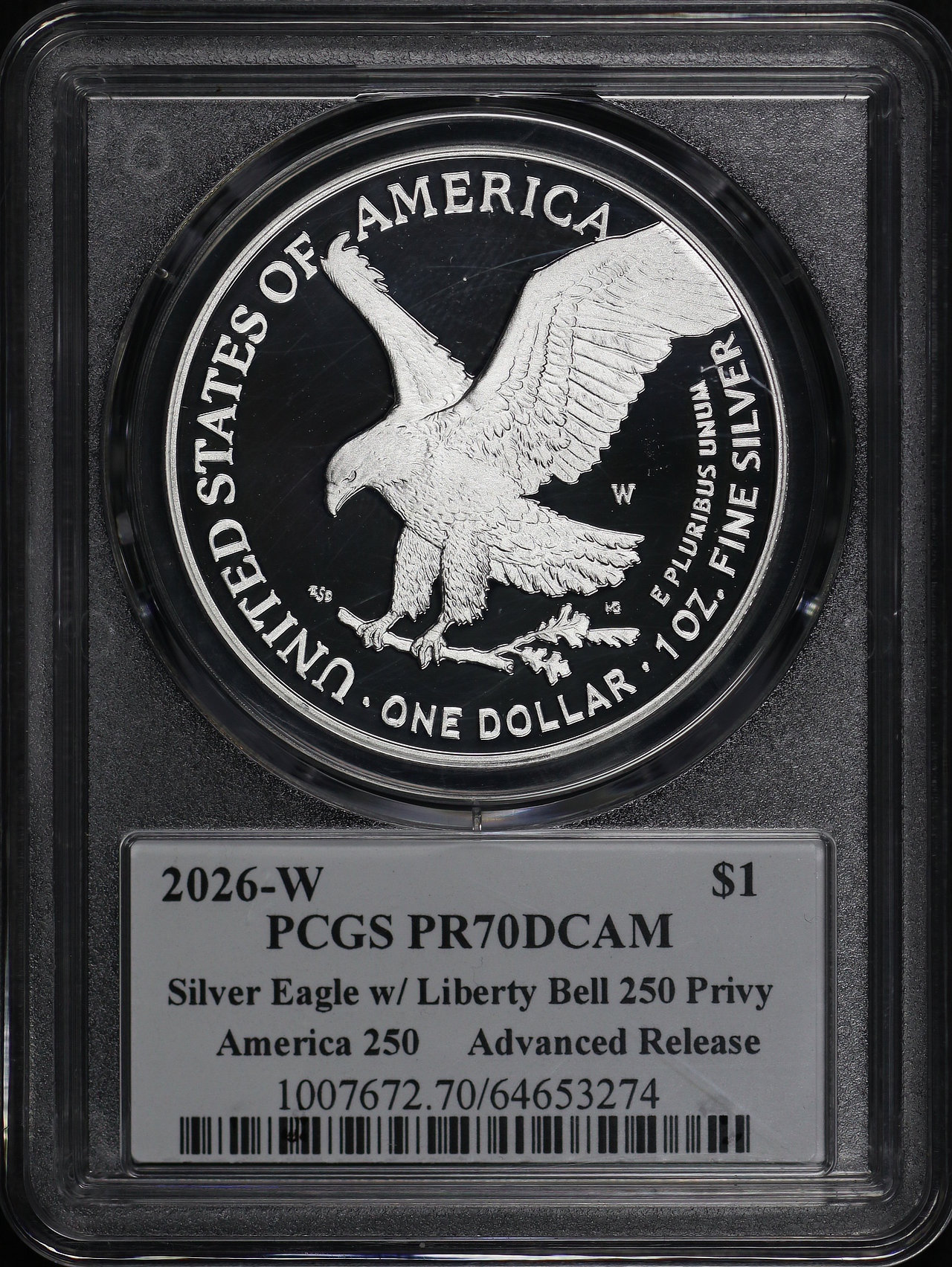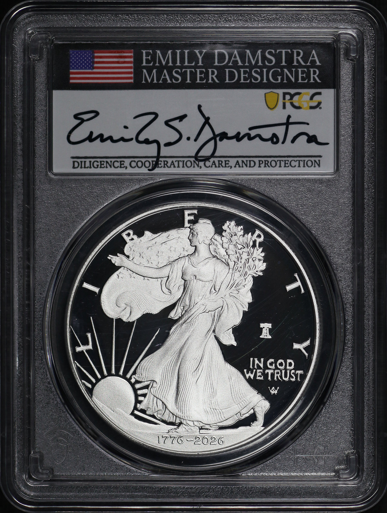 2026-W Silver Eagle Silver Eagle with Liberty Bell 250 Privy PCGS PR-70 DCAM Emily Damsta Signature label.