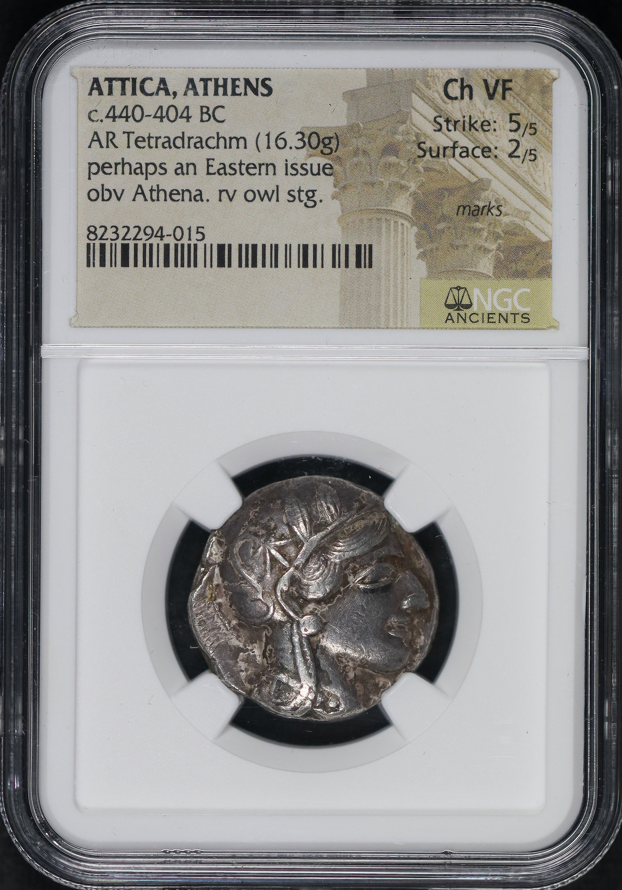 Attica, Athens c. 440-404 BC AR Tetradrachm (16.30g) Perhaps An Eastern Issue Obv Athena rv Owl Stg. NGC Ch VF Stike:5/5 Surface:2/5.