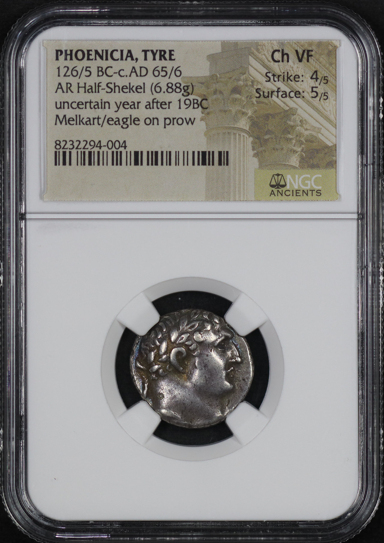 Phoenicia, Tyre 126/5 BC-c AD 65/6 AR Half-Shekel (6.88g) Uncertain Year After 19BC Melkart/Eagle On Prow NGC Ch VF Strike: 4/5, Surface: 5/5.